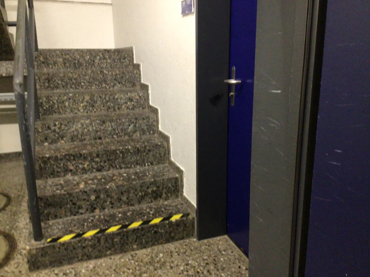 Treppe von der Halle und den Umkleideräumen ins EG, 7 Stufe je 17 cm - bis zum Zwischenboden - Handlauf links, rund, beginnt bei erster Stufe (markiert)und endet bei letzter Stufe